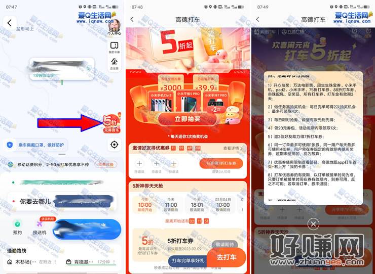 高德APP-打车-右侧【5折元宵喜乐】小图标进入-抽奖+抢券