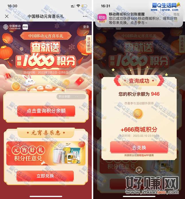 移动查积分领最高1000积分可撸实物 亲测666积分