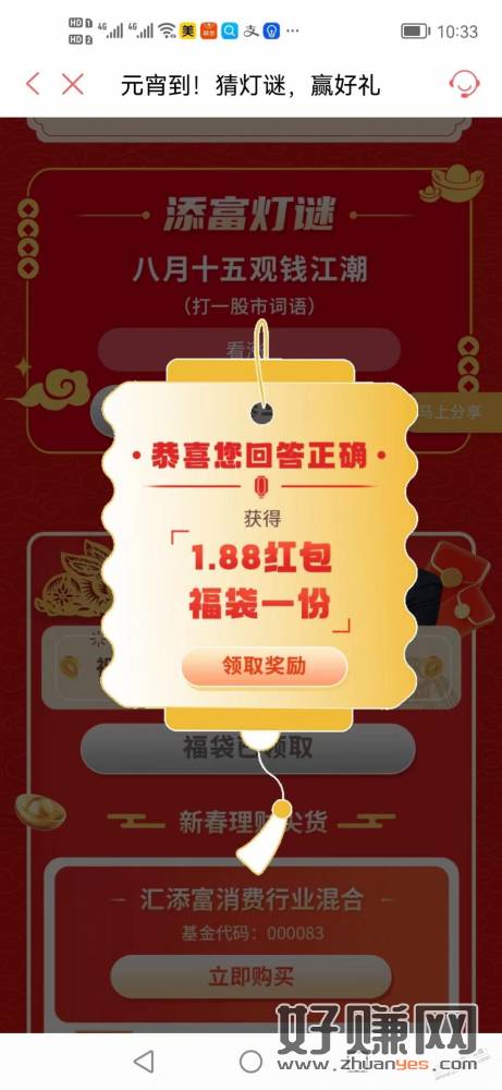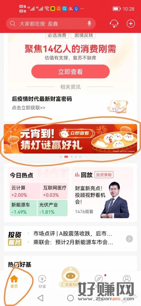 汇添富现金宝app,首页,中间横幅 元宵猜灯谜,答案 看涨 ,1.88元现金或1888添富币,
