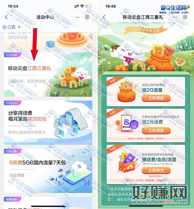和彩云APP/中国移动云盘APP-我的-活动中心-进去下拉找到自己所在地区的这个三重礼活动-进入完成任务领奖即可