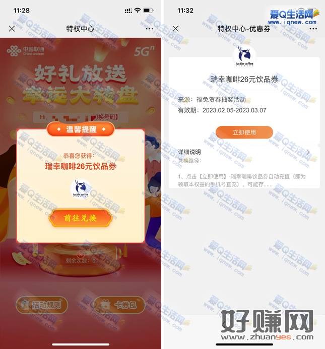 联通亲测中26元瑞幸咖啡饮品券 可0元咖啡