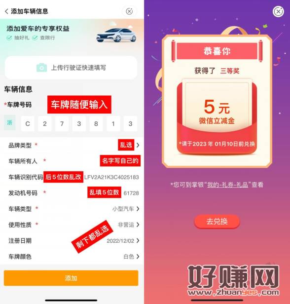农行APP搜索“任务中心”->添加车辆信息赢好礼->提示填写添加(识别代码LZWNCDH087Z108851后6位数乱改)->添加完成后返回任务中心抽5~20元微信立减