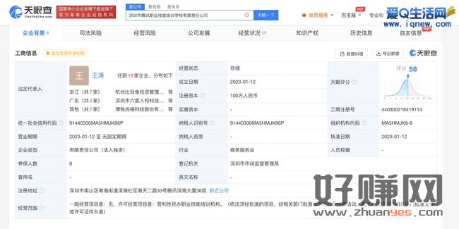 据悉深圳市腾讯职业技能培训学校有限责任公司成立,法定代表人王涛,这个公司的成立日期是2023年1月12日注册资本100万人民币,许可经营项目为营利性民办职业技能培训机构。股东信息显示,