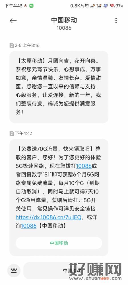 刚收到的短信,70G流量,不知道限地区不,太原的,有需要的拿,短信如下:
