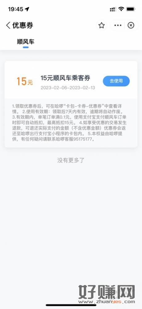 ZFB消费券搜哈啰,有机会得15顺风车券。无门槛的哦