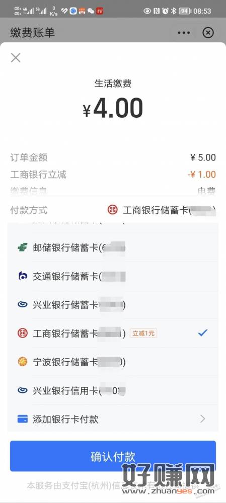 zfb生活缴费交电费5元,工行储蓄卡减1元。