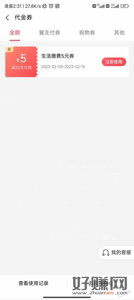 打开电信APP,第一次关闭弹窗后结束进程,然后重新打开有领取生活缴费优惠卷弹窗,领取后到账20-5,然后翼支付使用,2-2