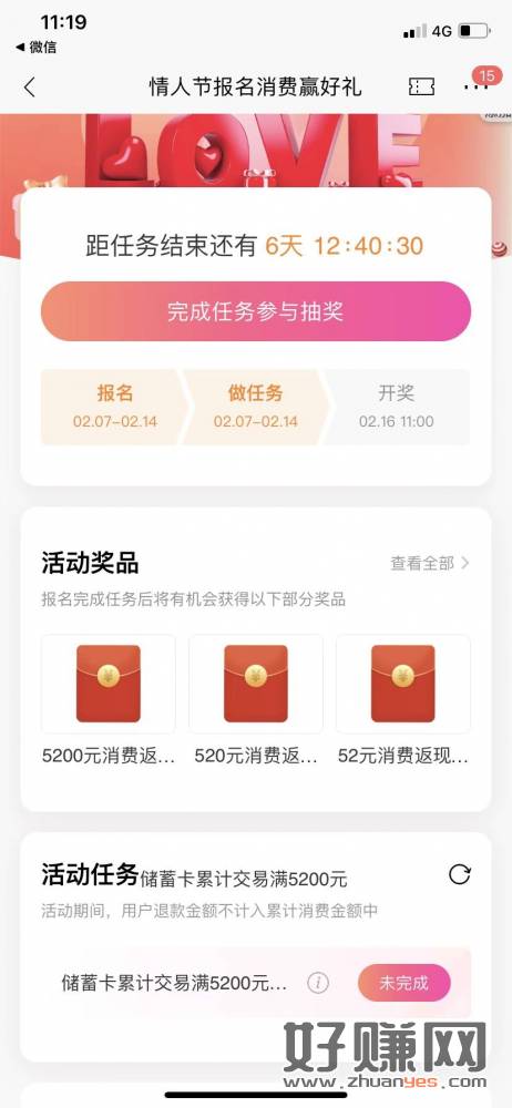 招商储蓄卡情人节活动抽5.2-5200大毛!