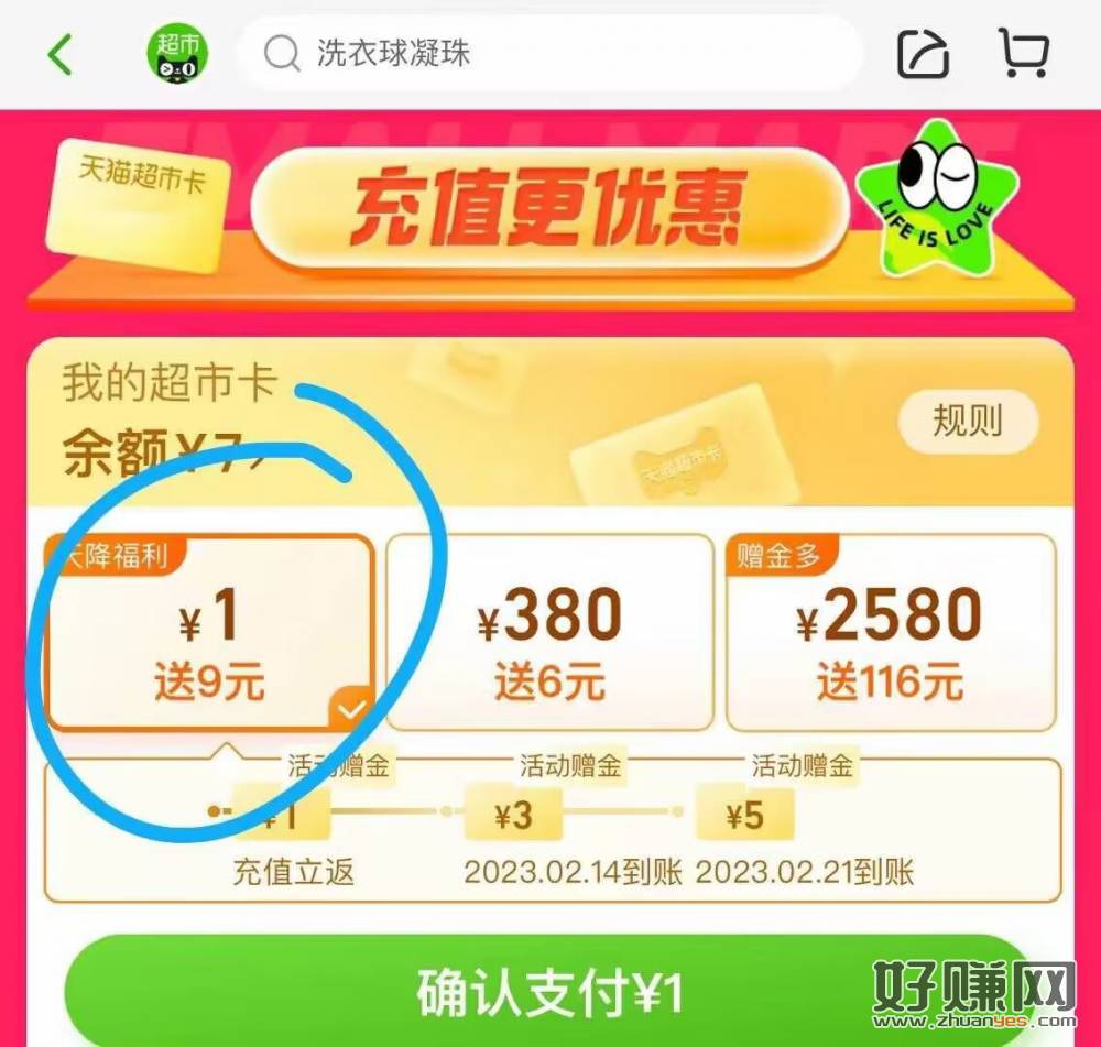 天猫超市-我的-超市卡 天天返乐多-往下滑 充1得9 分期赠