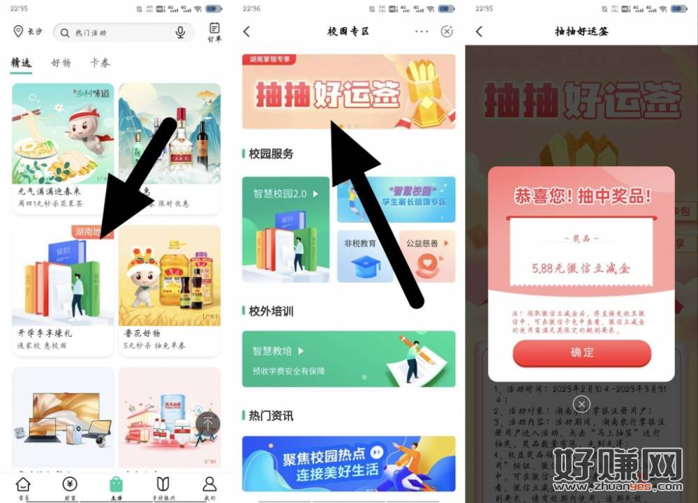 老农飞湖南 校园新一期活动 生活页面定位长沙–下拉–开学季享壕礼–上面横幅–抽抽