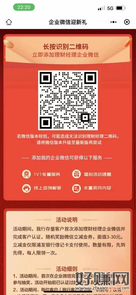 有浦发银行的 浦发银行App,生活,热门活动,最下面,贺行业企业微信迎新礼抽奖,必中 没机会的加客户经理认证即可