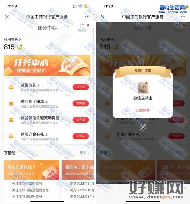 亲测1.88元微信立减金 工行完成浏览任务抽奖