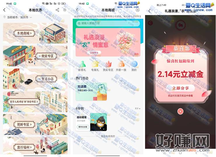 农业银行APP-本地优惠-手动切换到【广东深圳】-【本地商城】点进去-礼遇浪漫 农情蜜意-玩游戏抽立减金 假分多一次机会 非必中