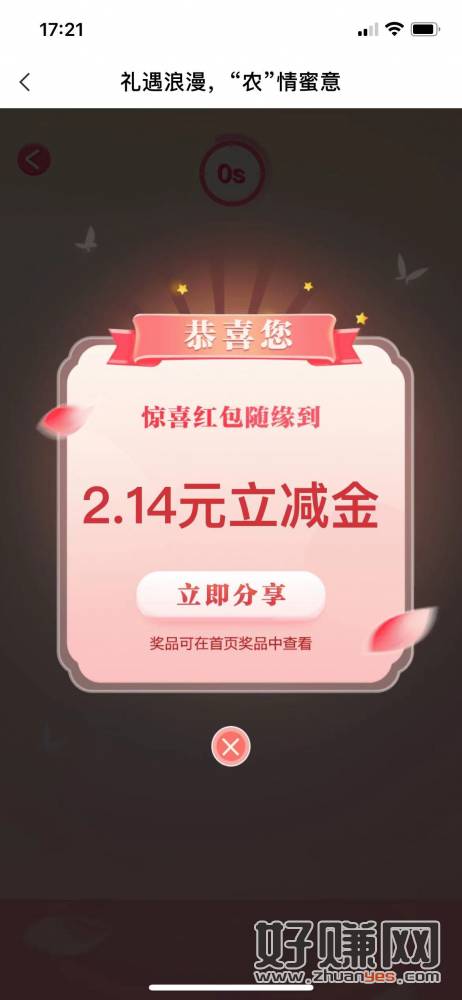 农行APP,城市专区,礼遇浪漫 农情蜜意,进入活动玩游戏可以抽2.14元立减金,分享还可以再抽一次,在我的奖品查看,再去第2步的小程序兑换