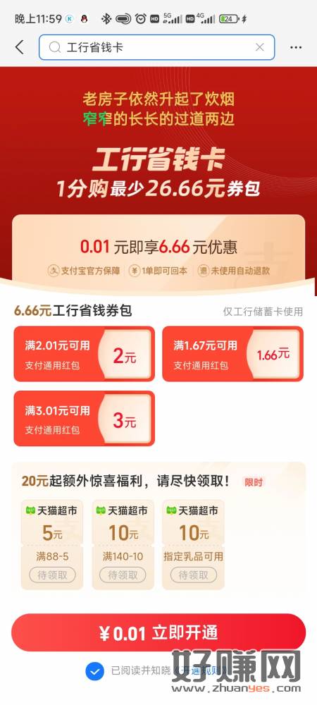 一分撸6.66大毛!支付宝搜工行省钱卡