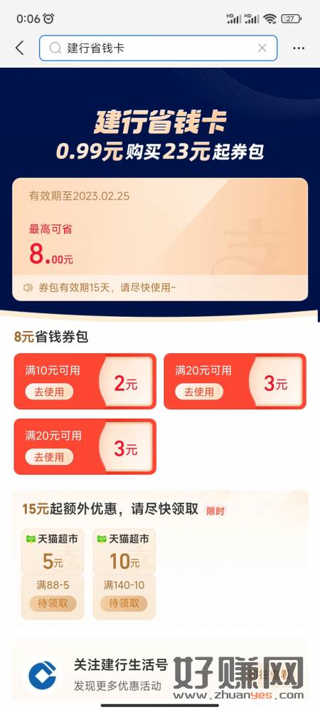 九毛九撸8.00大毛!支付宝搜建行省钱卡