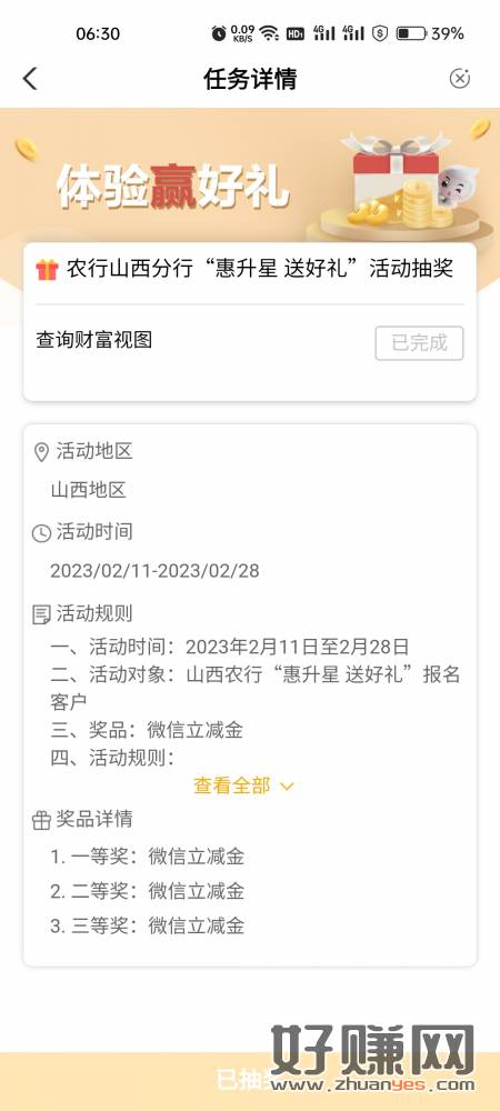 山西,任务中心!!!惠升星,送好礼!搜索财富体验,进去完成了,出来抽,我中了三等,5