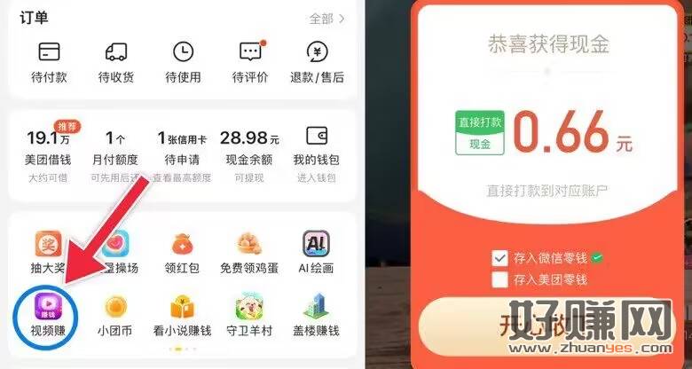 打开美团——我的——视频赚