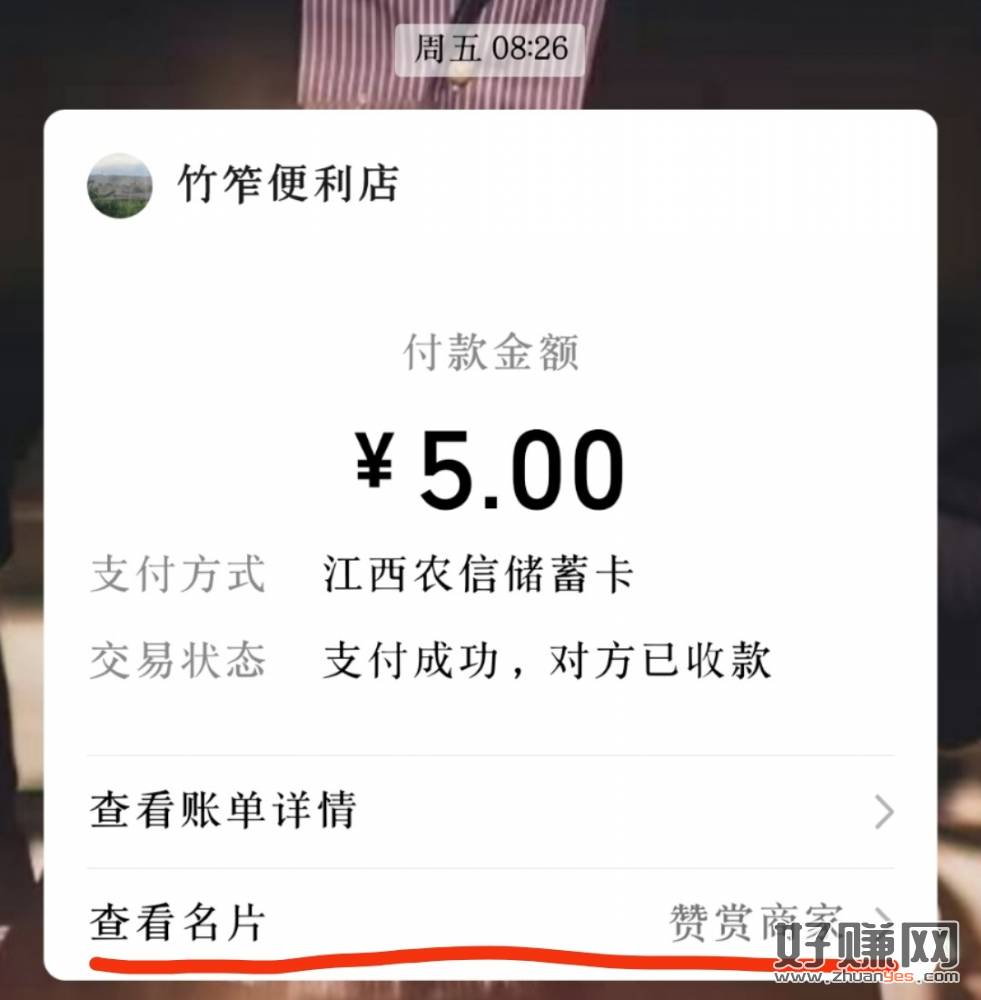 2 开通以后扫对方收款码付款一笔,然后在微信支付记录找到这个记录,点开下面的查看名片,出现图3的赞赏页面,选择下面的其他金额赞赏即可。(有立减金的话会自动显示优惠)