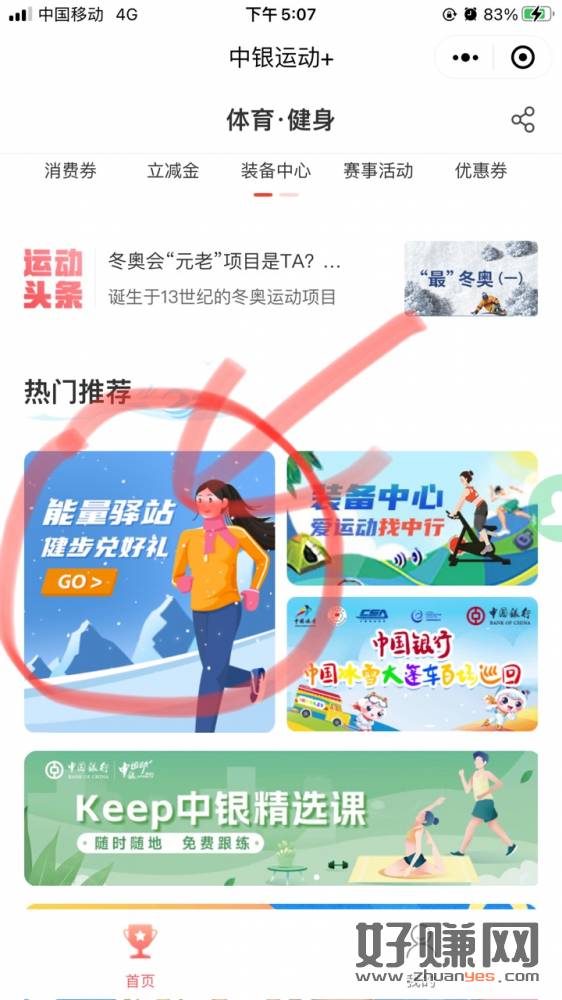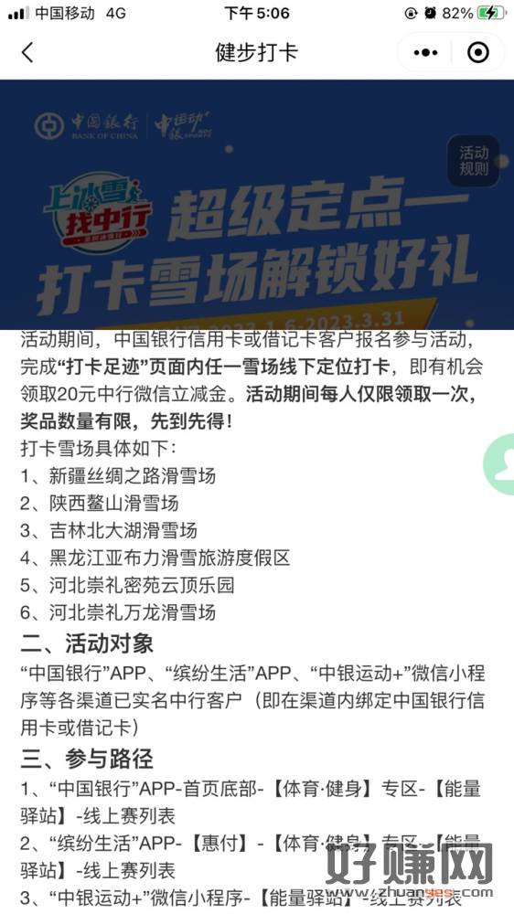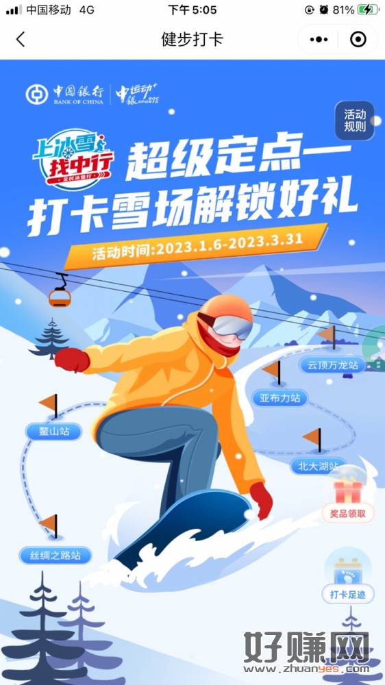 中行立减金 打开微信小程序 ,中银运动+ 小程序 ➡️能量驿站➡悦活运动➡️任务中心➡️游戏任务~雪场打卡挑战