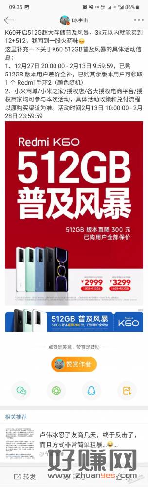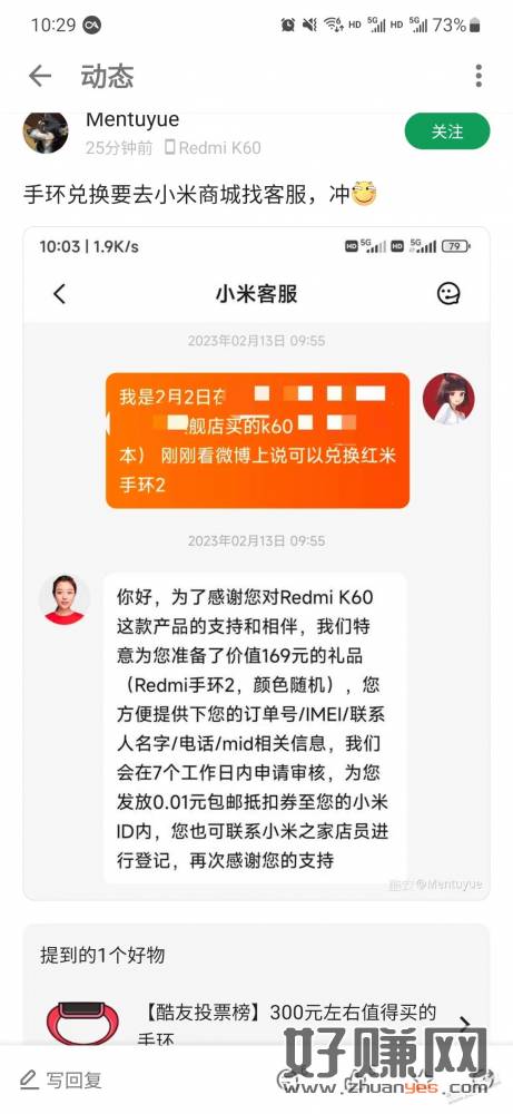 买过k60手机的都可以送红米手环