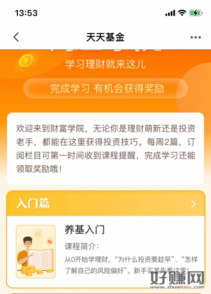 天天基金app 搜索 基金学堂-课程-养基入门 全部浏览完得6.8 不秒到