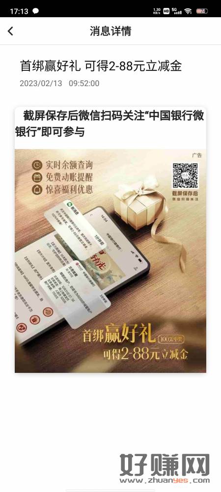 中国银行APP,消息里看看有没有,首绑微信中国银行微银行,抽