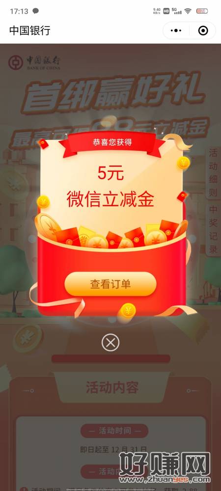 中国银行APP,消息里看看有没有,首绑微信中国银行微银行,抽立减金,保底2元微信立减金,实测五元的。