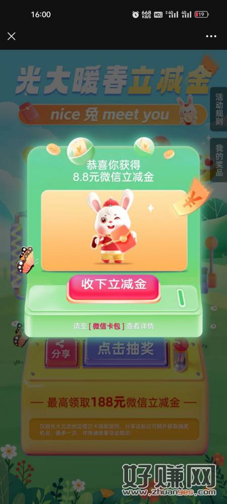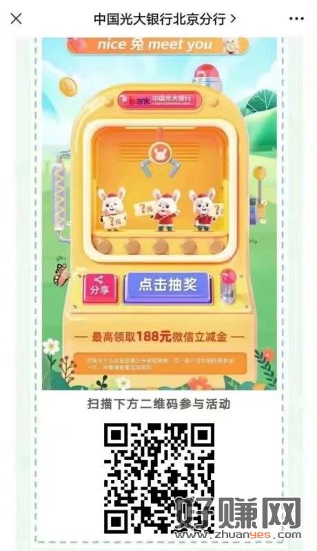 微信扫二维码,有光大银行卡,图片上说是北京分行,我在云南开的卡,也能扫,有光大银行卡的试试,得光大立减金,抓第几个兔子是8.8立减金呀,多微信,多扫