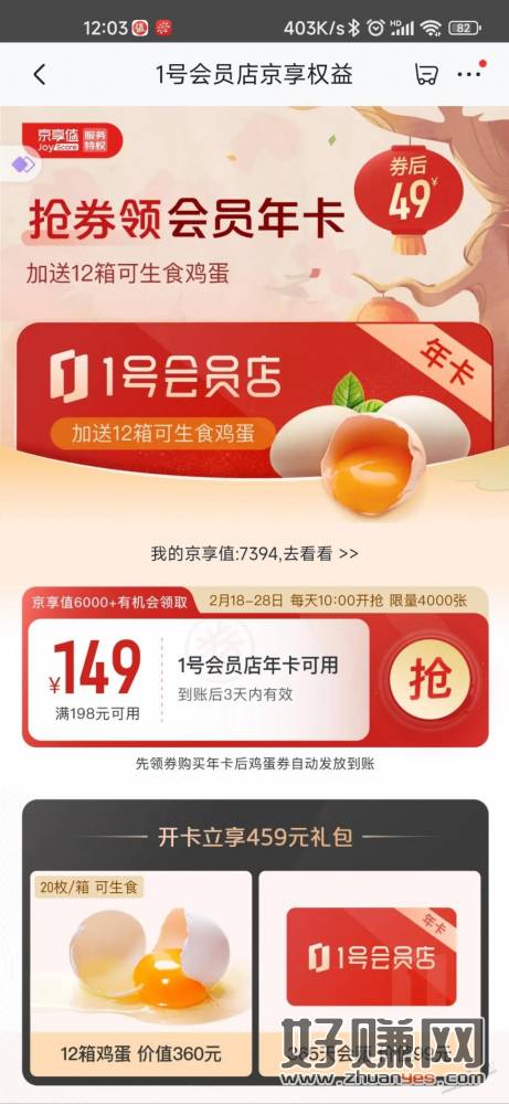 49开通1号店一年会员,一个月送20个鸡蛋。鸡蛋要付6元运费。京享值6000可以领