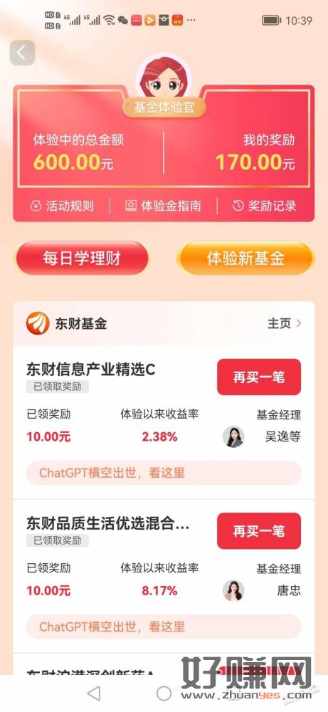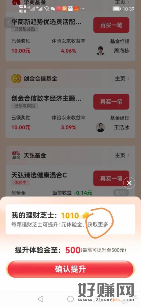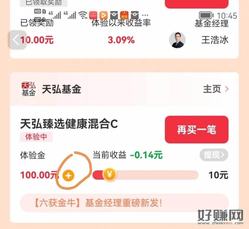 所以只要领取了体验基金,100体验收益有2时,获得理财芝士提现10是很容易的。