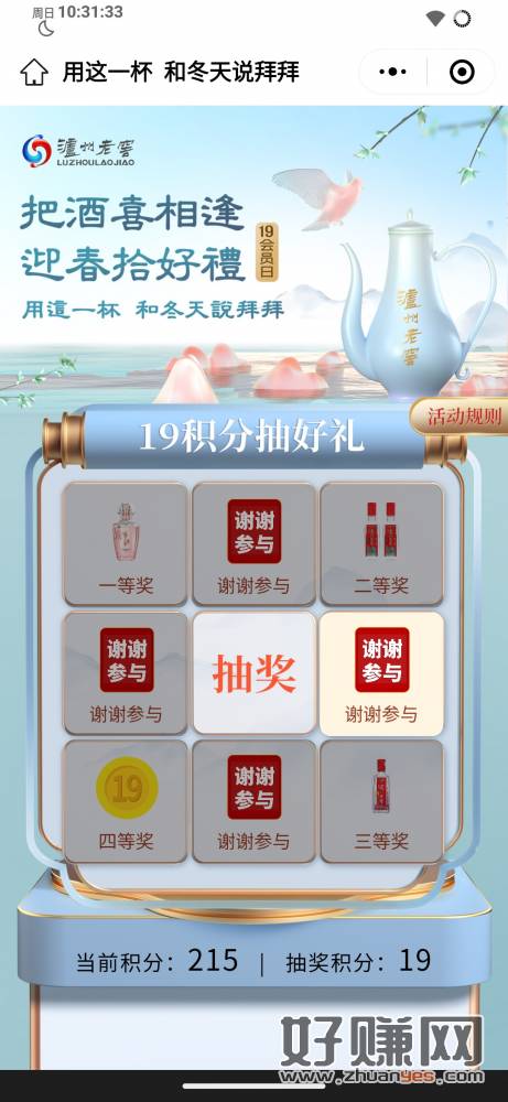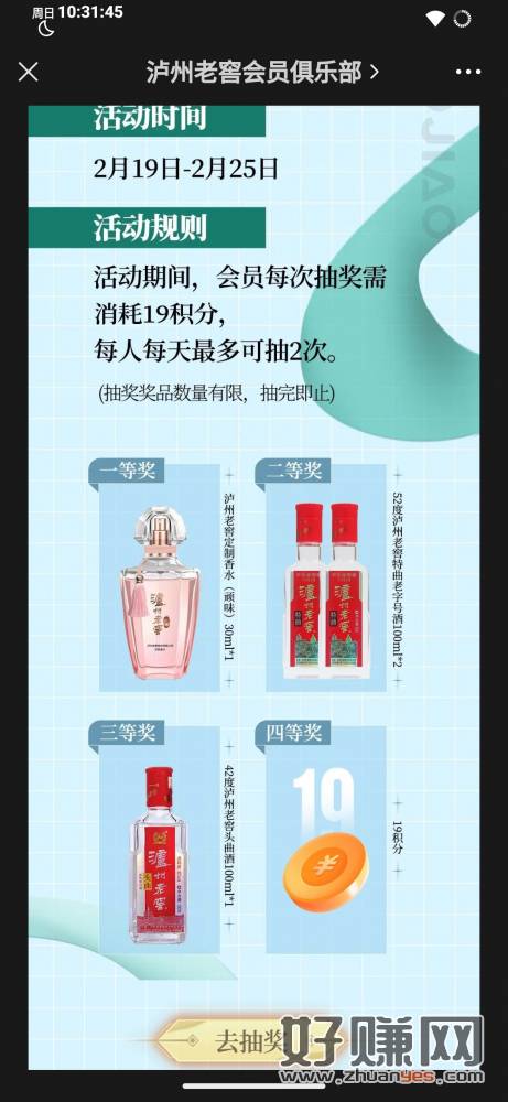 泸州老窖19会员日,19积分一次,每天两次,看脸,反正我是没中
