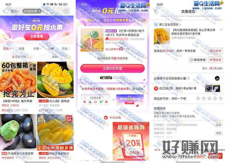1.拼多多-搜“0元抢水果”,50人成团后,每天19点开奖,多种水果随机发,名额有限