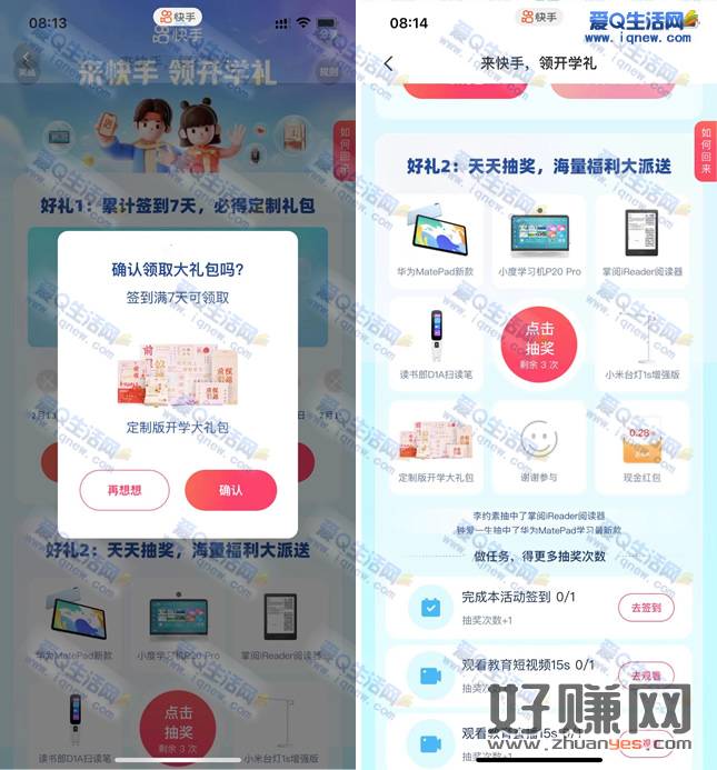 快手APP搜索【领开学礼】横幅进入-去参与好礼1和好礼2的活动即可,好礼1签到完7天需点击领礼包去填写地址才会发货