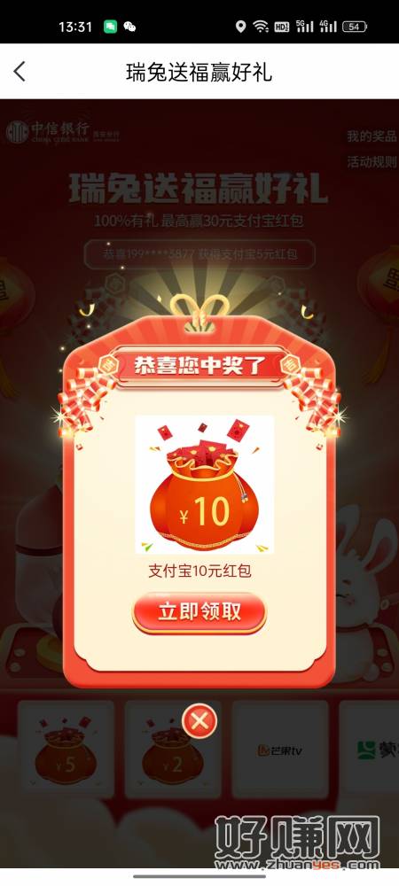 中信银行app,首页城市专区,定位改西安,下拉找到瑞兔送福迎