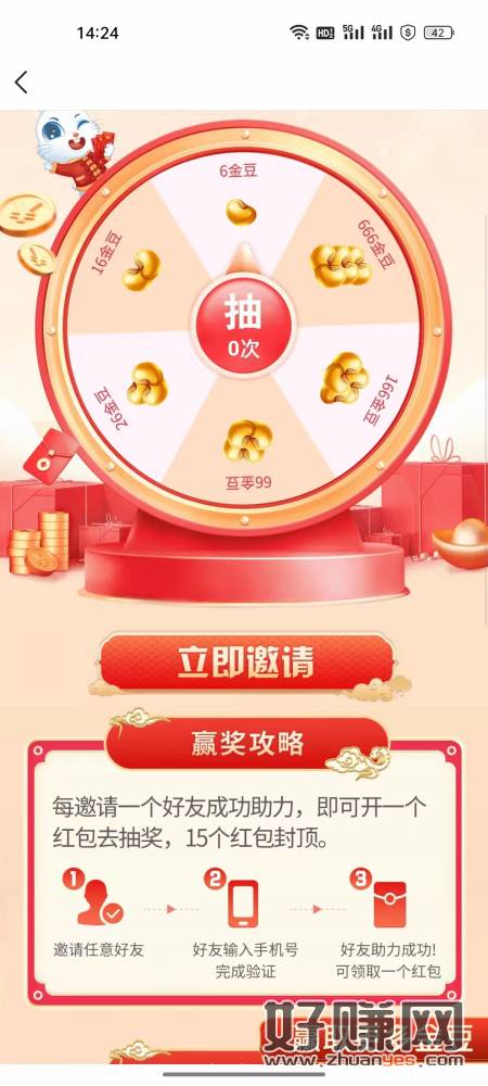 邀请好友抽奖,抽一次最低保底6金豆,10金豆等于一元,看脸也有大,可以邀请15次,接码走起