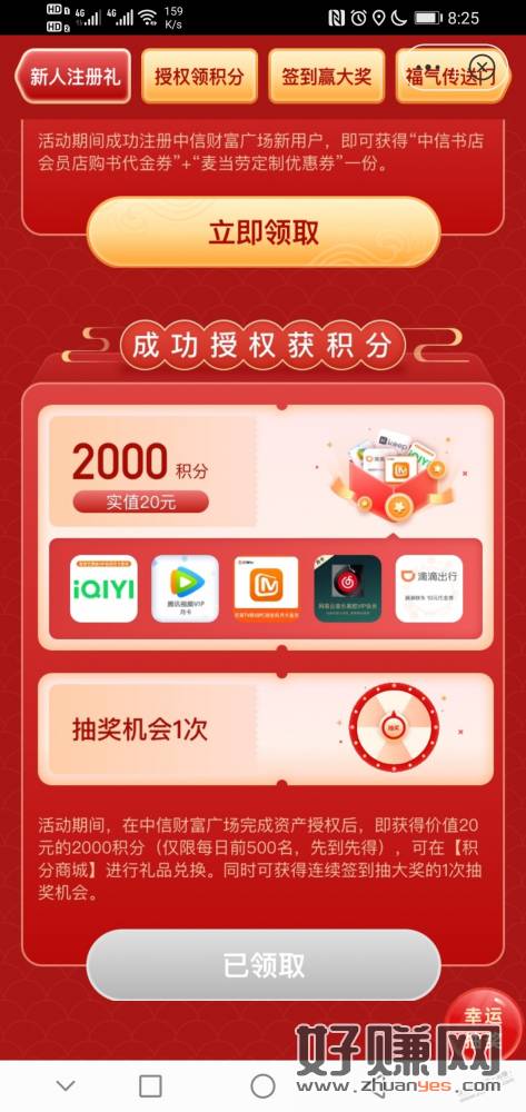 下拉页面点 成功授权获积分,授权3个里面的其中一个就行,授权后再返回活动里就可以领到2000个积分+1次抽奖机会,抽奖也会中积分,每天限前500个名额