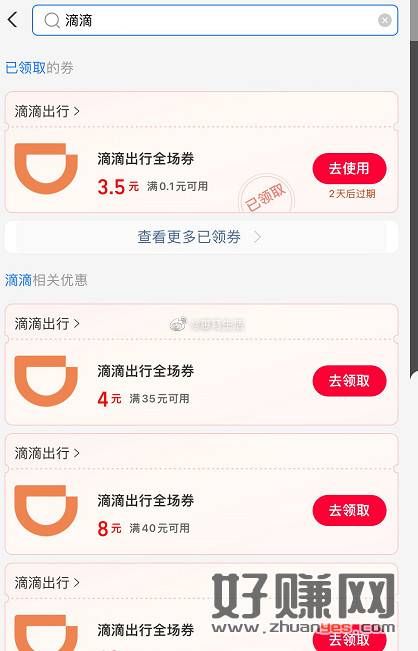 滴滴领3~8元无门槛打车券