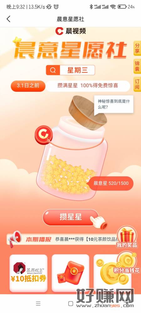 晨视频APP做任务攒星星,大概三天可以抽了,抽到茶颜悦色润5