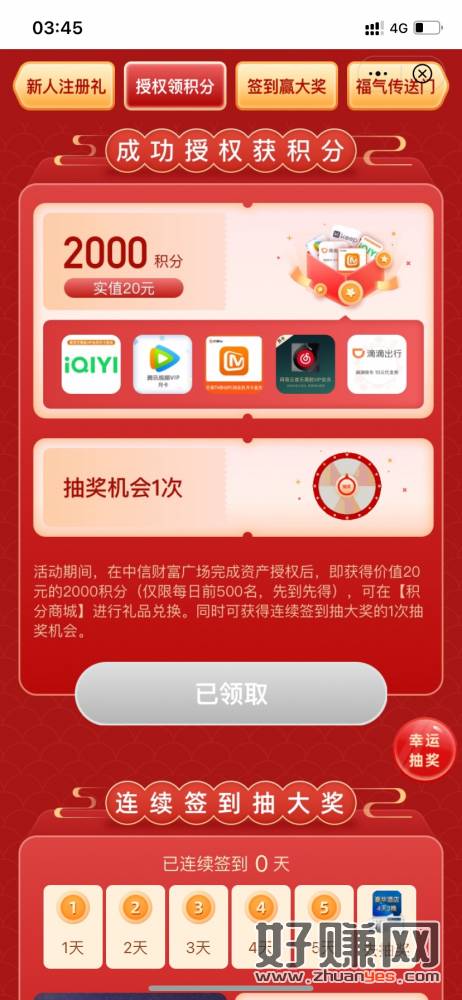 中信银行 需要中信财富广场新户 授信完送2000积分 还可以抽奖一下 低保200积分 可以换视频会员月卡直充
