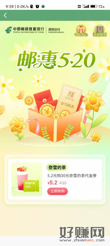 深圳邮政 活动专区 5.2买 30奈雪代金券 玖玖20出
