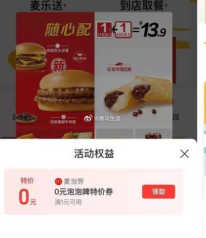 【麦当劳免费领0元泡泡啤】支付宝APP扫码->直接领取->点到店单 随单消费即可使用