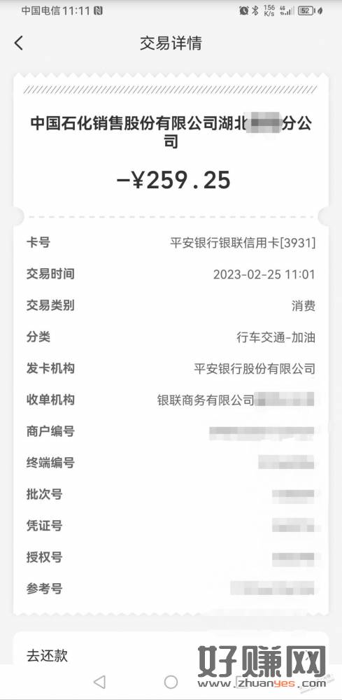 今日加油305,银联入账259.25,平安返现完实付207.25。