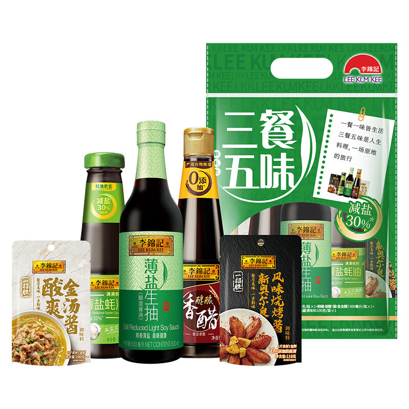 李锦记三餐五味套装,生抽+蚝油+香醋+金汤酱+烤肉酱