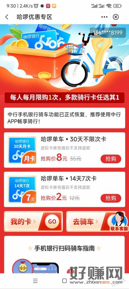 中行 生活 8元哈罗,注意预留号码和单车一致 到账