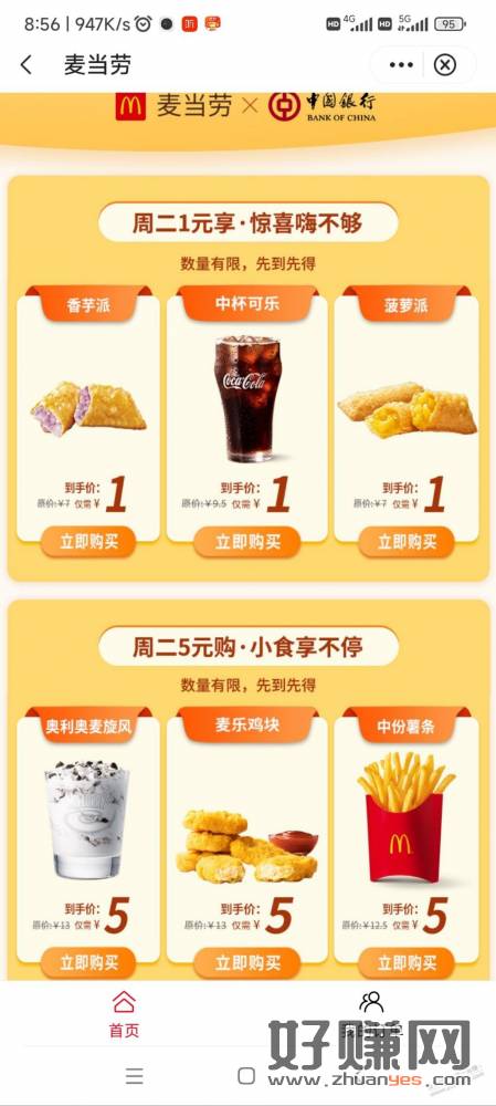 中行app周二 麦当劳单品1/5元