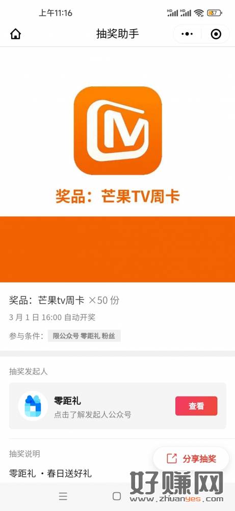关注微信公众号【零距礼】回复“抽奖” 参与抽奖 奖品:芒果tv会员周卡 开奖时间:3月1日