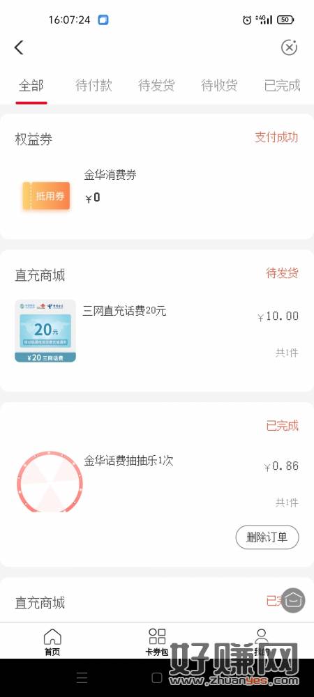 农行飞浙江金华196999-城市专区-惠享金华-话费抽抽乐支付0.86抽奖中了10充20话费