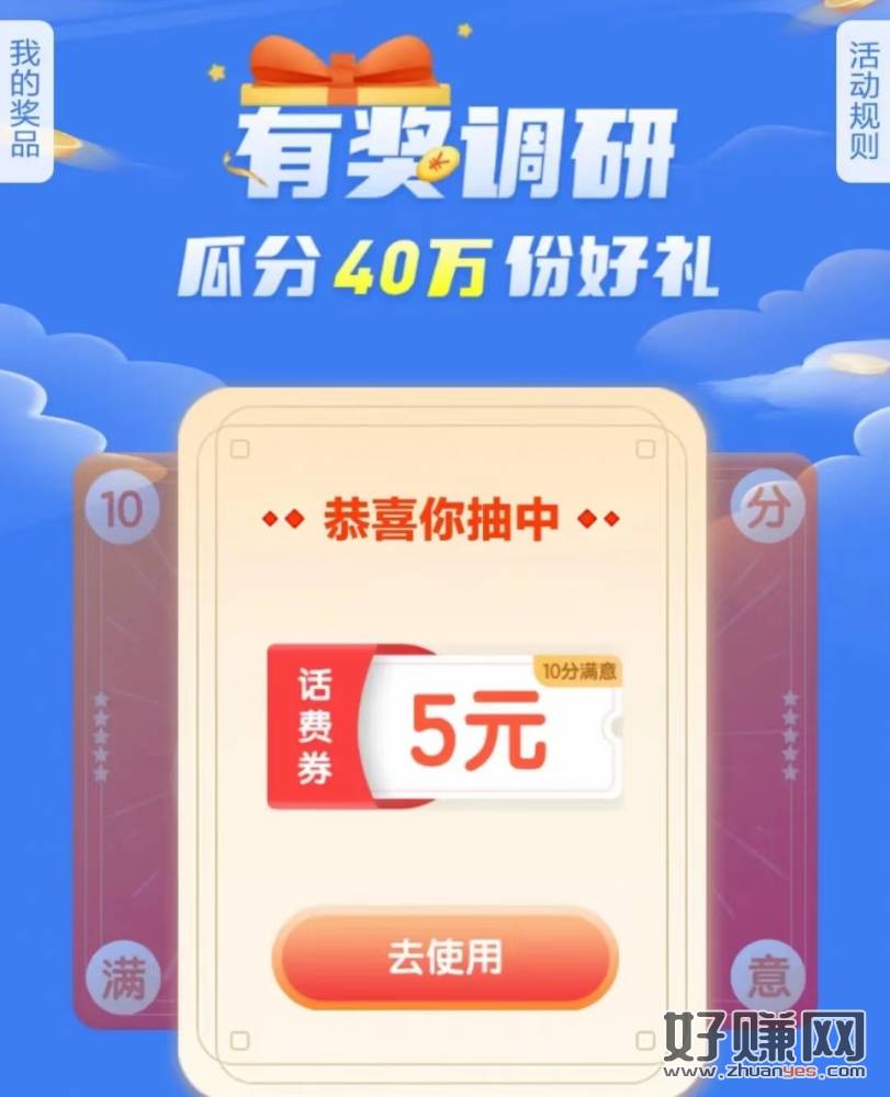 〖操作流程〗:中国移动app->首页“热门活动”有个10分满意抢5元话费->进去问卷->简单填一下即可。