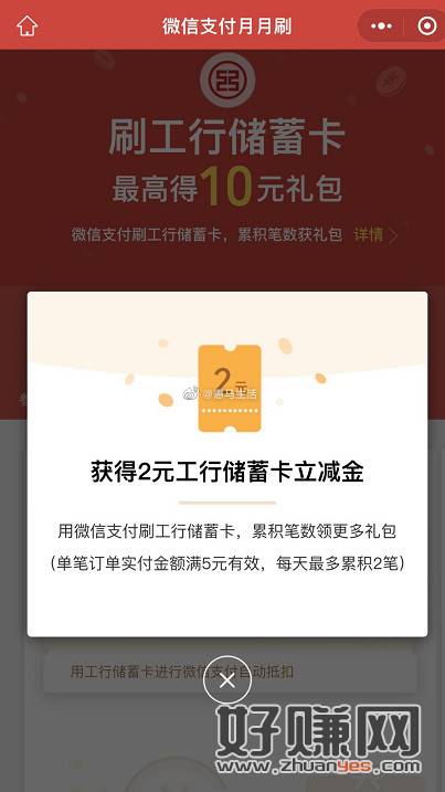 【工行消费领最高10元微信立减金】新一期!微信扫码进入->直接领2元立减金->累计消费满3/5/10笔且每笔大于等于5元(转入零钱通也计入笔数,每天上限统计2笔)再分别领取1/2/5元立减金